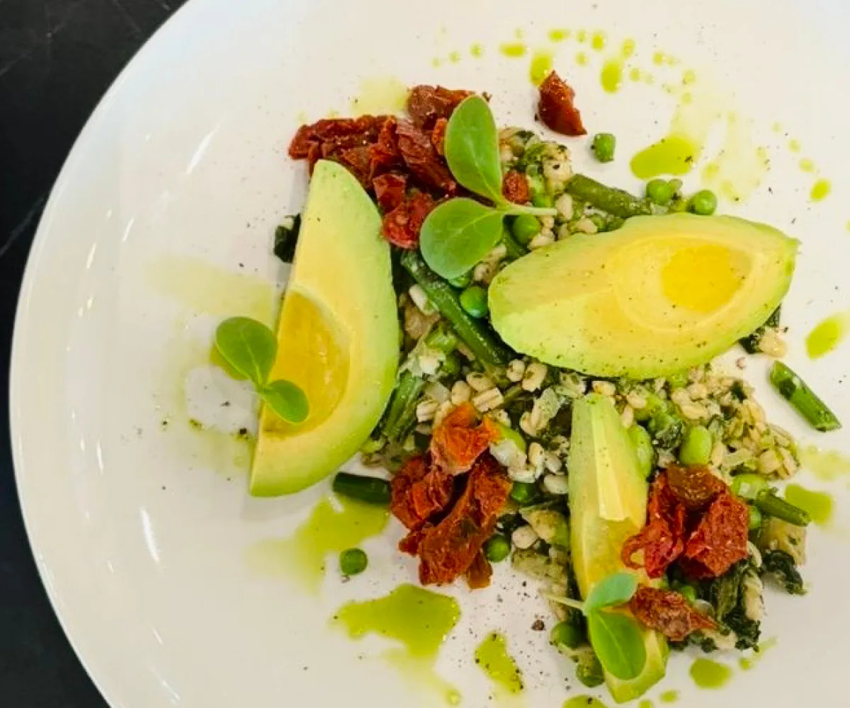 Ein köstliches Beispiel: unser erfrischender Gerstensalat mit cremiger Avocado und feinem Öl-Dressing. Zart gegarte Gerstenkörner verbinden sich mit knackigem Gemüse, frischen Kräutern und der mild-nussigen Note der Avocado zu einer harmonischen Komposition, die belebt und zugleich angenehm sättigt.Â