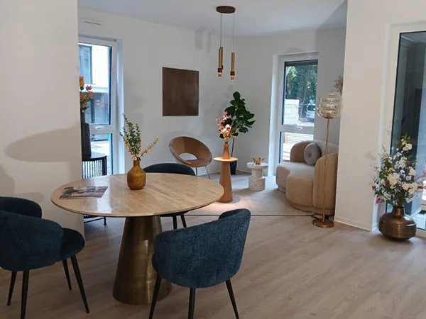 Wohnbereich mit Essecke, separierter Schlafbereich mit bodentiefen Fenstern, offene Einbauküche, Badezimmer mit ebenerdiger Dusche, integrierter Abstellraum mit Waschmaschinenanschluss, eigener Briefkasten und Wohnungsklingel mit Videogegensprechanlage